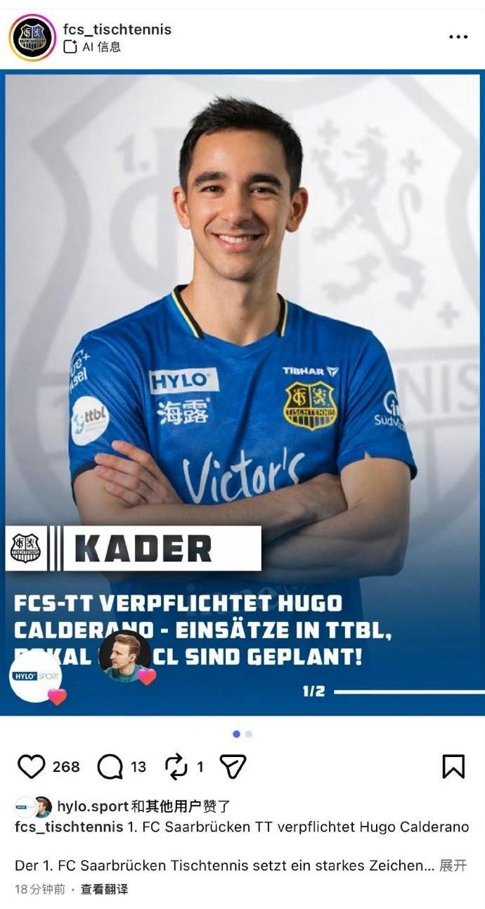 2月6日,巴西乒乓球名将雨果官宣加盟德甲萨尔布吕肯俱乐部,与樊振东成为队友。总监埃尔温-贝格表示:“我们无比荣幸,能迎来雨果-卡尔德拉诺这样的世界顶尖选手加盟萨尔布吕肯。在达科离队后,他正是以世界顶级水准填补这一空缺的最佳人选。雨果带来了国际顶尖的竞技水平、丰富的大赛经验,也正是我们球队当下所需的硬实力,助力球队在下赛季重新向各项冠军发起冲击。”雨果说道:“...