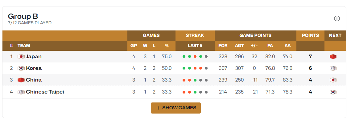 当下中国男篮、中国台北男篮都是1胜2负积分4分,中国队-11第三,中国台北队-21第四。(日本3胜1负第一、韩国2胜1负第二)规则是小组前三晋级第二阶段,第四被淘汰,所以中国队能击败日本非常重要。
