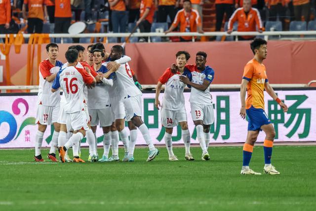 2024年3月31日,上海申花队球员在比赛中庆祝进球。 当日,在2024赛季中国足球协会超级联赛第三轮比赛中,山东泰山队主场0比3不敌上海申花队。 新华社记者 朱峥 摄